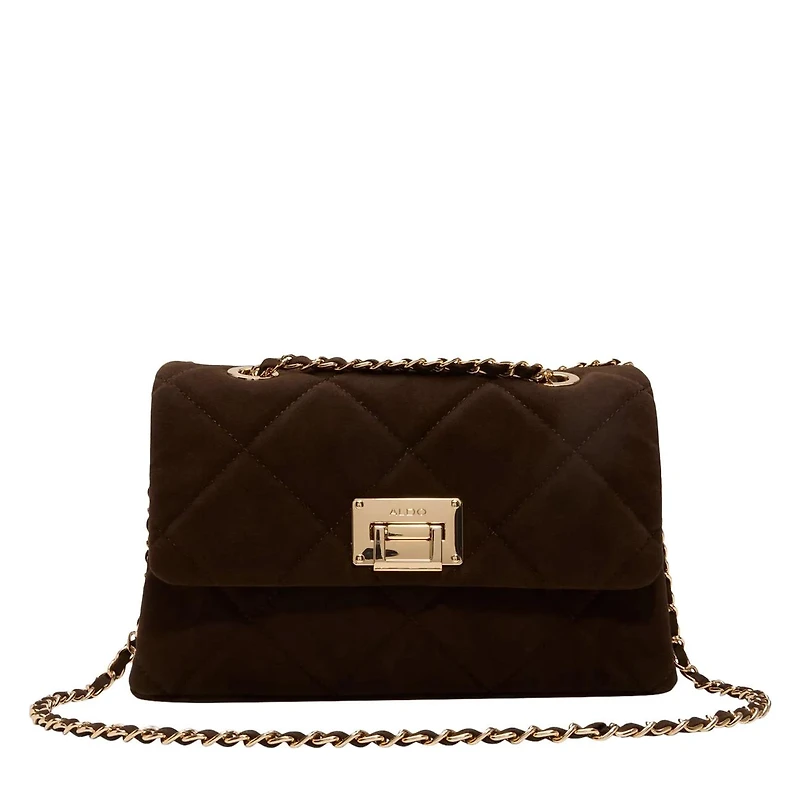 Quilted detailing, a chain strap, and a rectangular snap closure define the satchel from Aldo. The woven strap transforms this handbag into a crossbody or shoulder bag depending on your mood.