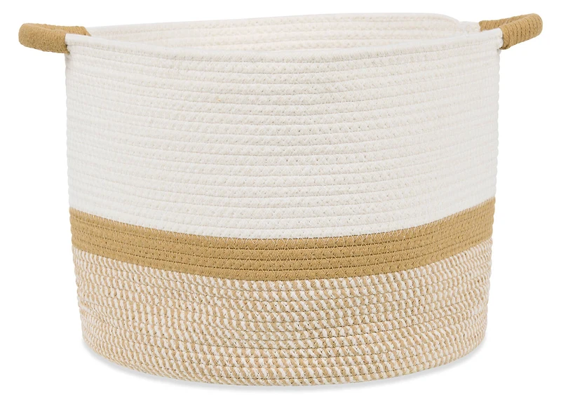 Our Rosio Basket is a stylish, catch-all storage solution with two top loop handles for easy maneuvering from room to room. This style is woven in a round shape from durable cotton-poly blend and has an ultra-versatile neutral colourway.