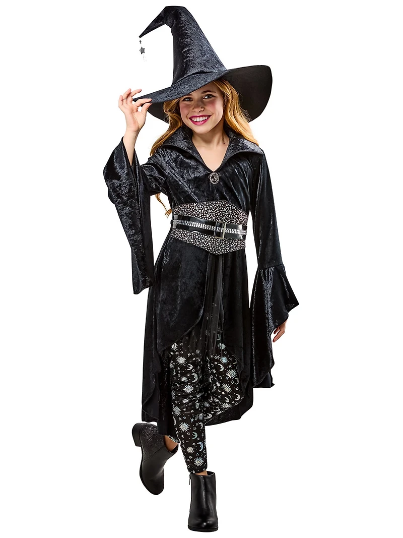 Cast a spell of style and sparkle with the Rubies Black Coven Witch Costume for Kids, a bewitching blend of spooky fun and celestial charm! Perfect for friendly witches-in-training, this magical costume features a flowing black velvety hi-low dress with dramatic bell sleeves, a wide collar, and an attached moon brooch that gives a vintage vibe. The bodice is cinched with a double belt, one adorned with a silver starry print and the other styled like a riveted faux leather strap, giving it a mystical-meets-modern twist. Paired with black leggings sprinkled with shimmering silver suns, moons, and stars, your little witch will look like she just flew in from a midnight sky. And no coven is complete without a classic black pointed witch hat, finished with a charming star that dangles from the tip like a little cosmic secret. Perfect for Halloween haunts, fall festivals, enchanted school parties, storybook parades, or just a little everyday dress-up magic, this costume is spellbinding all year long. Grab a broomstick and gather the coven, this look is even more fun when worn with friends or family dressed as fellow witches, black cats, moon fairies, or warlocks. Whether she's casting pretend spells or twirling under the stars, your little one will feel like the friendliest witch in the woods! From humble beginnings as a candy store in 1951, Rubies has flourished into an industry dress-up leader and is now a part of a bigger family of brands. With costumes, accessories, wigs, masks, decor and more tailored to perfection, we put our customers at the heart of it all. Through high-quality products, partnerships with major licensors, and an expanding global presence, Rubies has carved out a niche as the definitive destination for fun and festivities. While we embrace our past, we also reinvent it by actively adding to our repertoire of licensed and non-licensed products, keeping our customer fulfilled with the latest trends. For over 70 years, Rubies has focused on creating products that inspire unforgettable moments for all, every day of the year.
