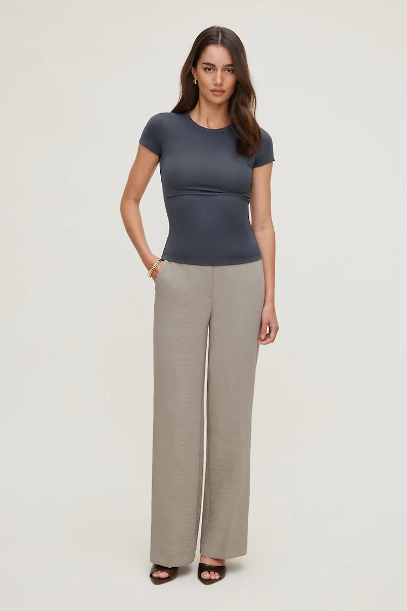 This T shirt is made from a light, stretchy rayon jersey with a soft handfeel. It's designed for a fitted silhouette and hits right at the waist for casual, everyday wear. Style it with