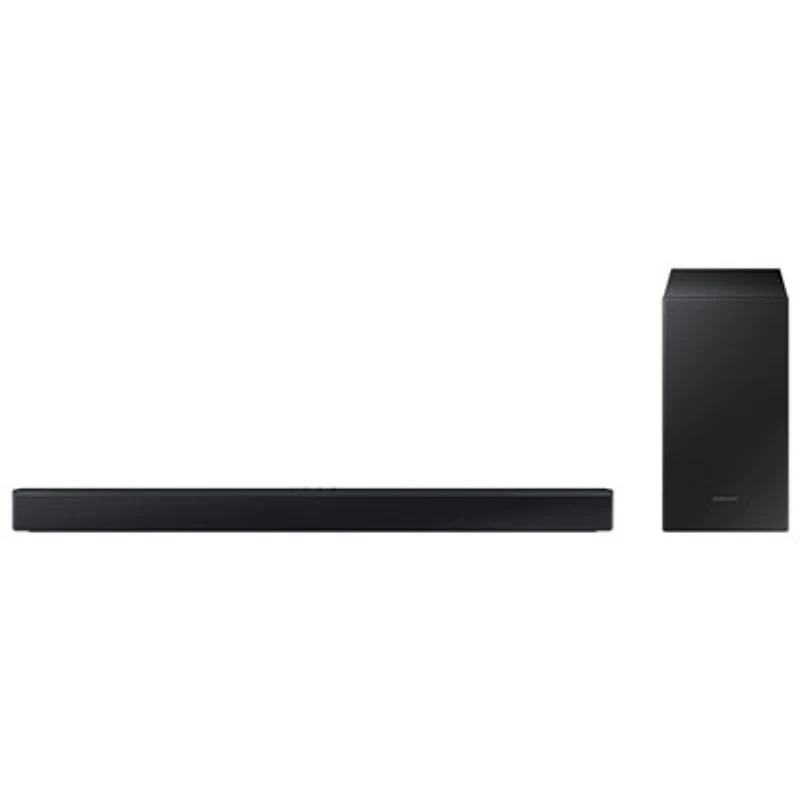 Level up your home audio with the Samsung 2.1 channel sound bar. Featuring a Bluetooth TV connection, this soundbar can be paired with a TV, delivering wireless convenience. The included wireless subwoofer adds powerful bass for a richer sound experience. The Game Mode and Night Mode let you enjoy customized sound. | Samsung HW-C445/ZC 2.1 Channel Sound Bar with Wireless Subwoofer