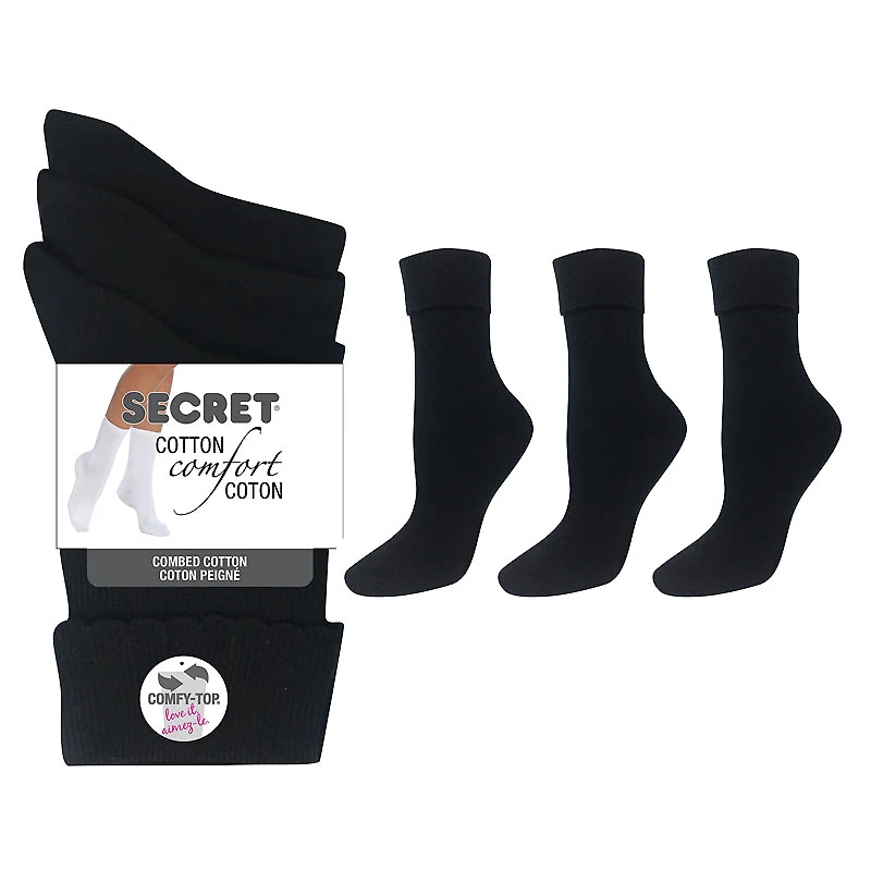 Secret Cotton Comfort Fashion Socks Rib/Cuff Socks - Black - 3 pair