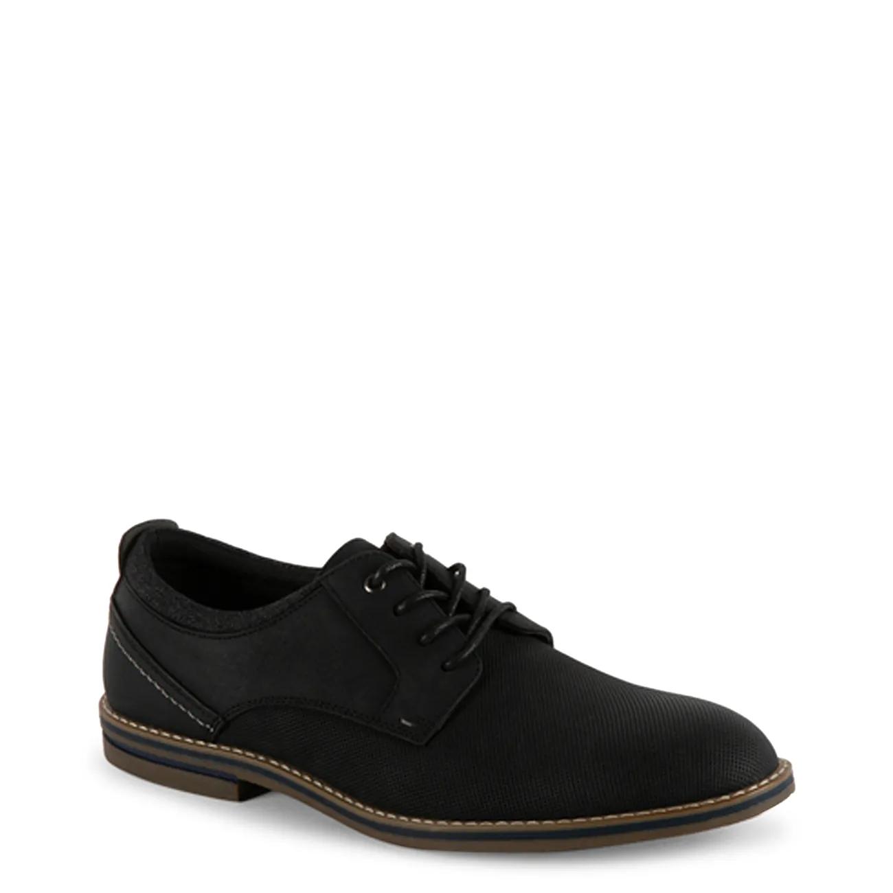 Perforated textures on the upper add a unique appeal to these men's Steve Madden Sergey black dress shoes crafted with soft synthetic upper and fabric lining for lasting wear. Almond toe offers a trendy look while adjustable lace-up closure provides a precise fit. Durable rubber sole with low block heel gives secure footing.