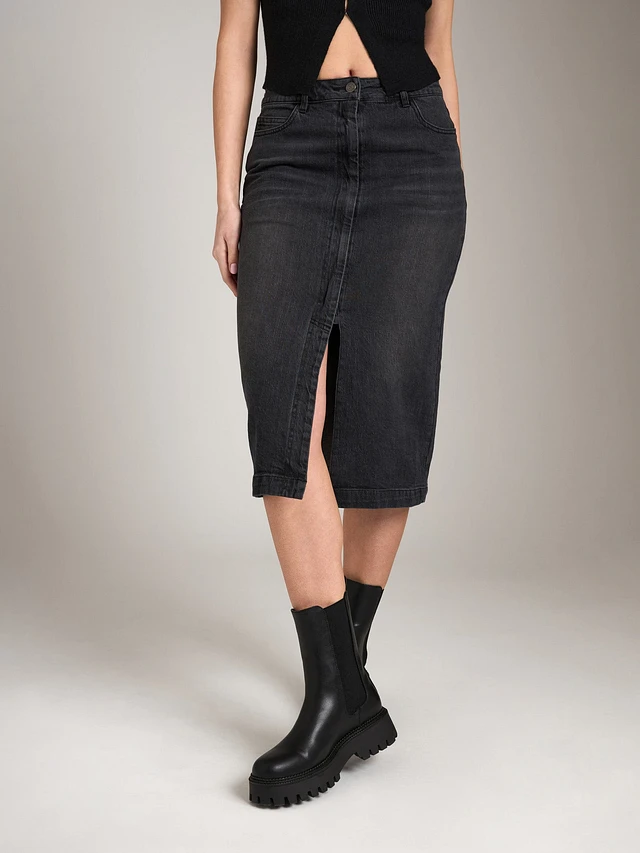 Seville Denim Midi Pencil Zip Skirt - Washed Black