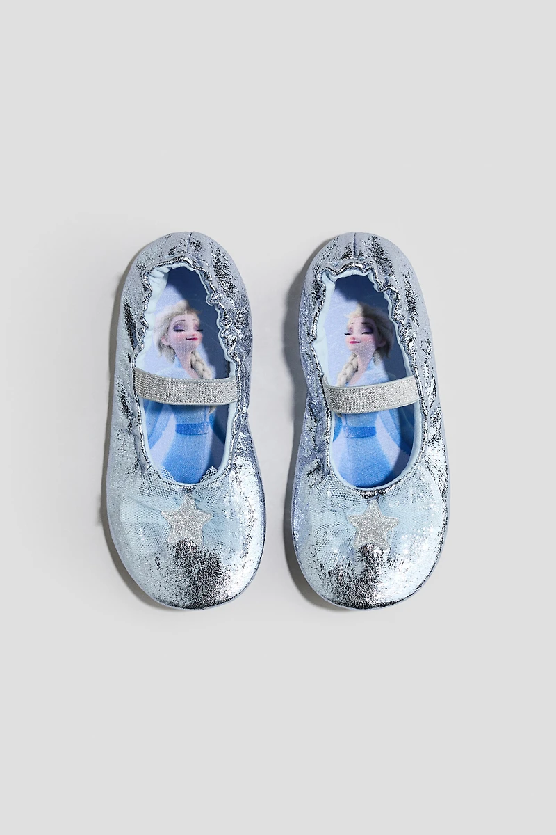 Shimmery metallic ballet shoes with a decorative tulle bow at front. Elasticized opening and an elastic foot strap. Lining in jersey, insoles in jersey with a printed design, and soft soles. For indoor use only.