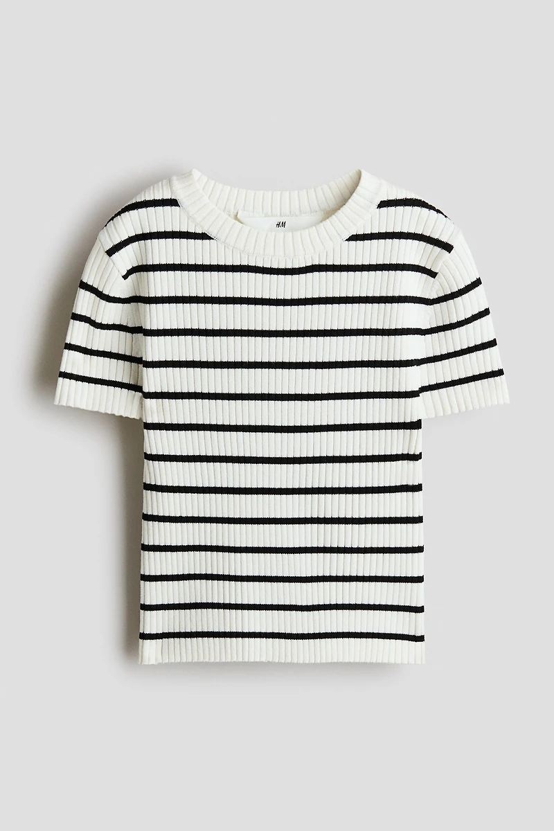 Short, soft, rib-knit top. Round neckline and short sleeves.