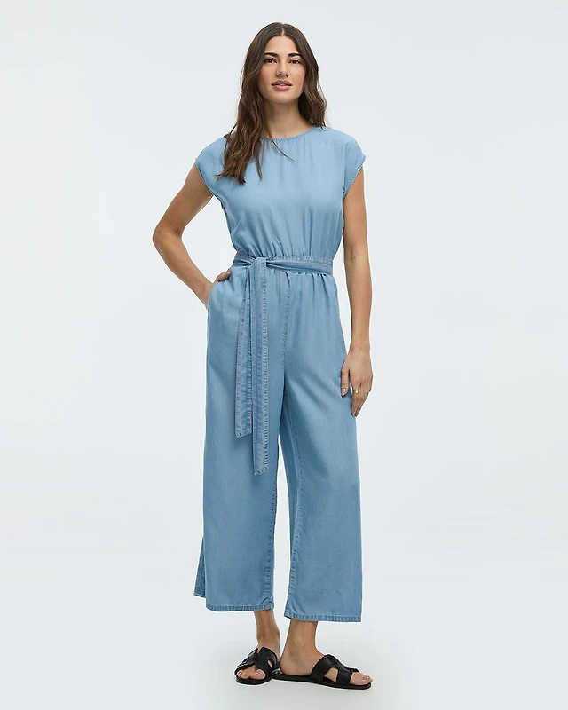 Straight-Leg Short-Sleeve Jumpsuit with Crew Neckline