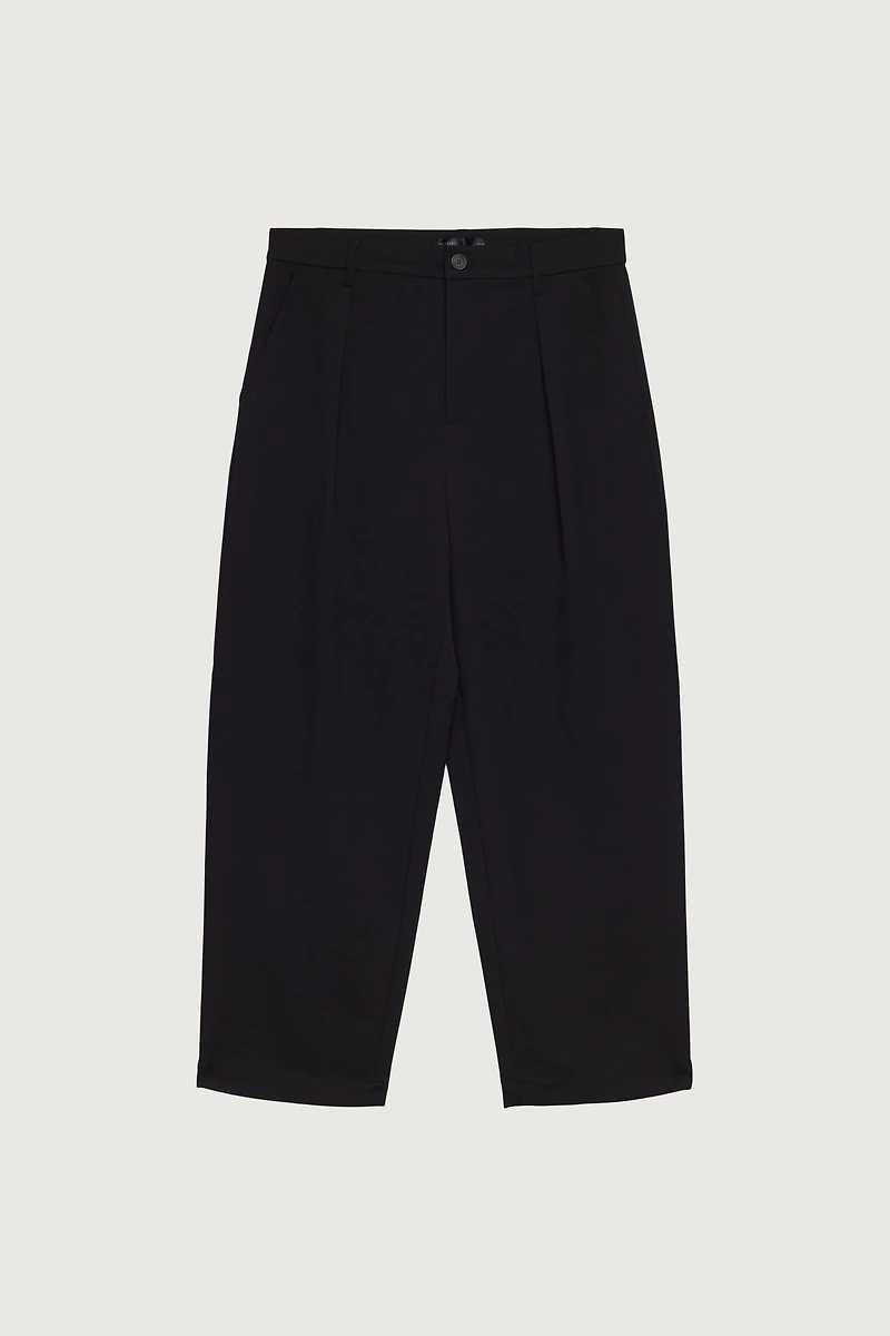 Classic fit. Mid-rise, elasticated waist. Straight leg. Front pleats. Belt loop. Slash pockets. Back welt pockets. 27" inseam.