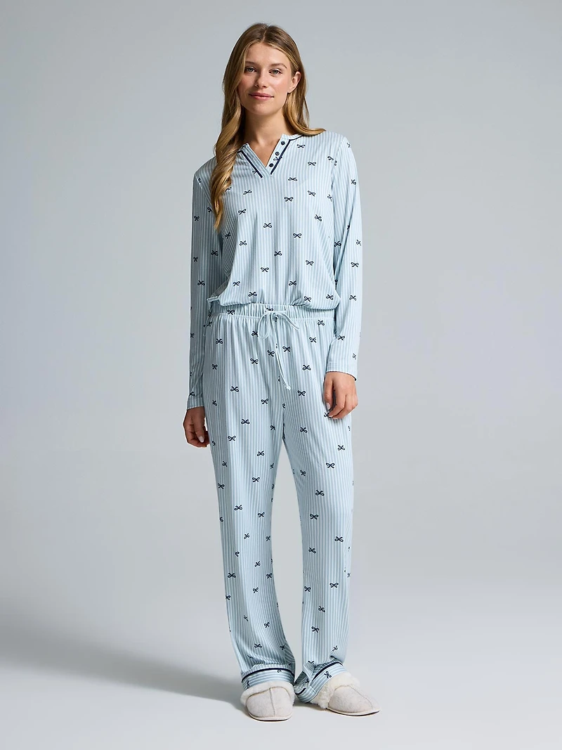 Go to bed feeling your best with these striped bow split collar pajamas! They're comfortable, stylish, and designed to make your nights as cozy as possible.Knit pajamas2-pieceStriped bow printPopover top with split collarLong sleevesPull-on pants with drawstring at waistSoft fabricModel is wearing size XSFabric: 92% polyester, 8% spandexMachine wash inside out in cold waterHang to dry