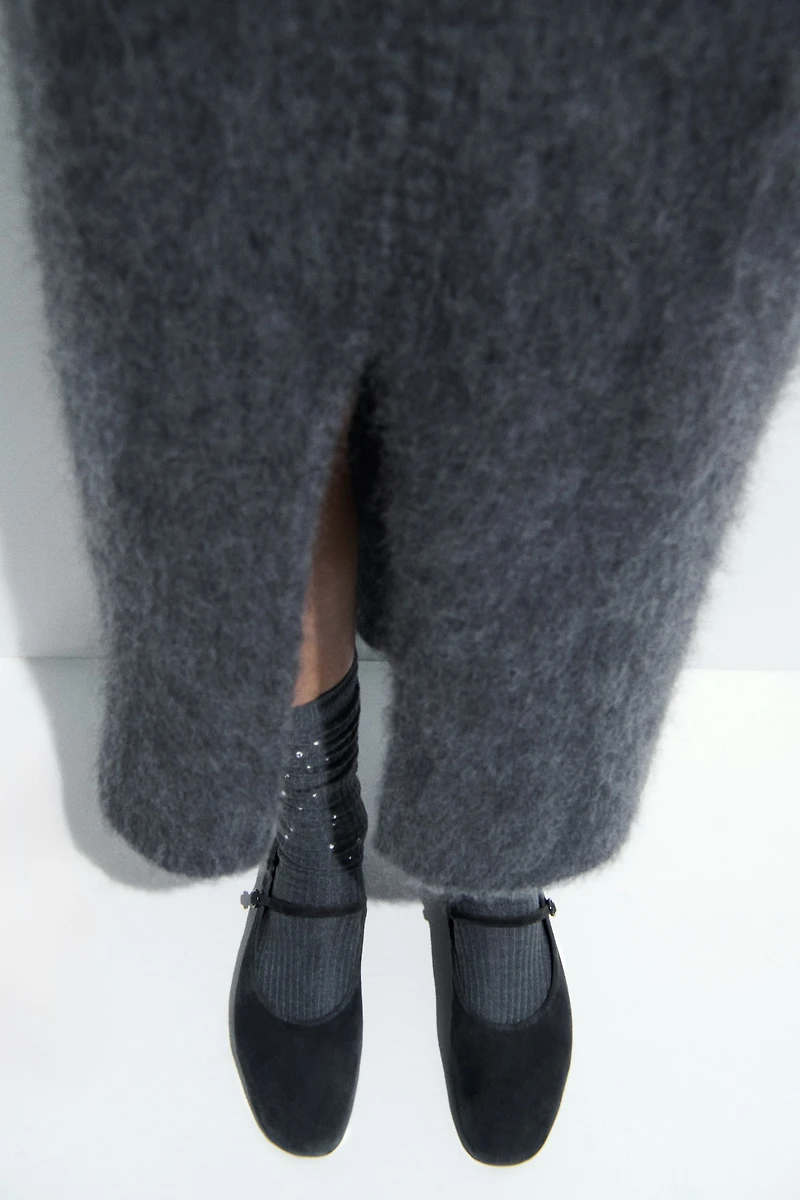 Mary Jane-style flats in soft suede with rounded toes. Adjustable foot strap with a metal buckle, lining in twill, and insoles in leather.