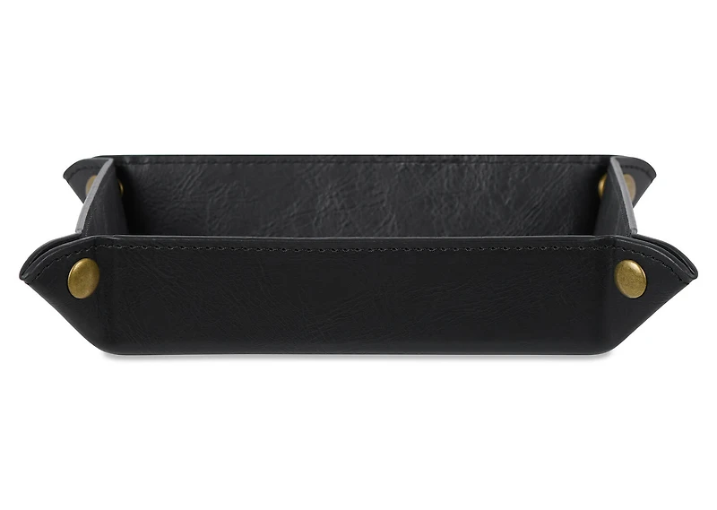 Our Tessa Trinket Tray will add a touch of refinement to your décor. Made with black faux leather, this tray offers a polished look that enhances everyday storage of smaller items, from your house keys to loose odds and ends.