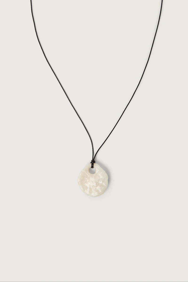 This necklace features an organic-shaped stone suspended from a corded chain. A minimal statement piece designed for effortless layering or standalone wear.