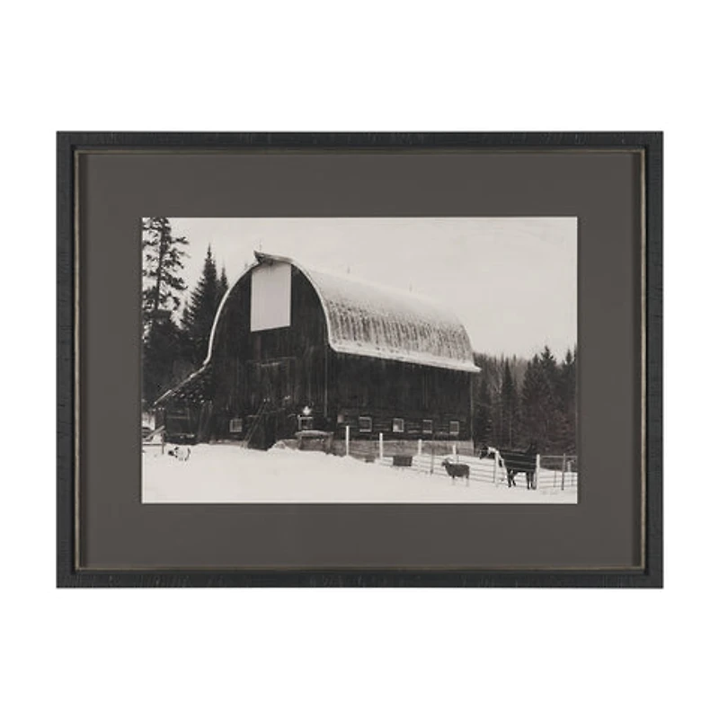 "The Farm" by Deborah Revell is a timeless black-and-white photograph capturing a rustic barn blanketed in snow, surrounded by serene wintery landscapes. The striking contrast between the dark wood of the barn and the pristine white snow evokes a sense of nostalgia and tranquility. This piece is a perfect homage to rural simplicity, drawing inspiration from the quiet beauty of winter’s embrace.