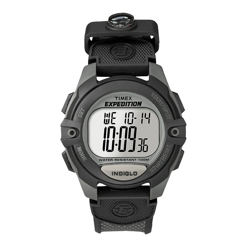 Never miss a beat with this TIMEX Expedition digital watch. This durable, rugged outdoor timepiece is water resistant to an astounding 100 metres, allowing you to keep moving no matter the weather conditions. It comes packed with convenient tools designed to save you time and energy. The 100 hour chronograph with lap and split times and the 100 hour countdown timer can easily be stopped, started and reset for your convenience. Two time zone settings, month, day and date display, and a customizable alarm help you stay on top of tasks. The INDIGLO light-up watch dial makes it easy to check the time at night or in dim settings. This TIMEX Expedition digital watch features a handy analogue mini compass integrated into the wristband | Timex Expedition Resin Strap Watch in Black