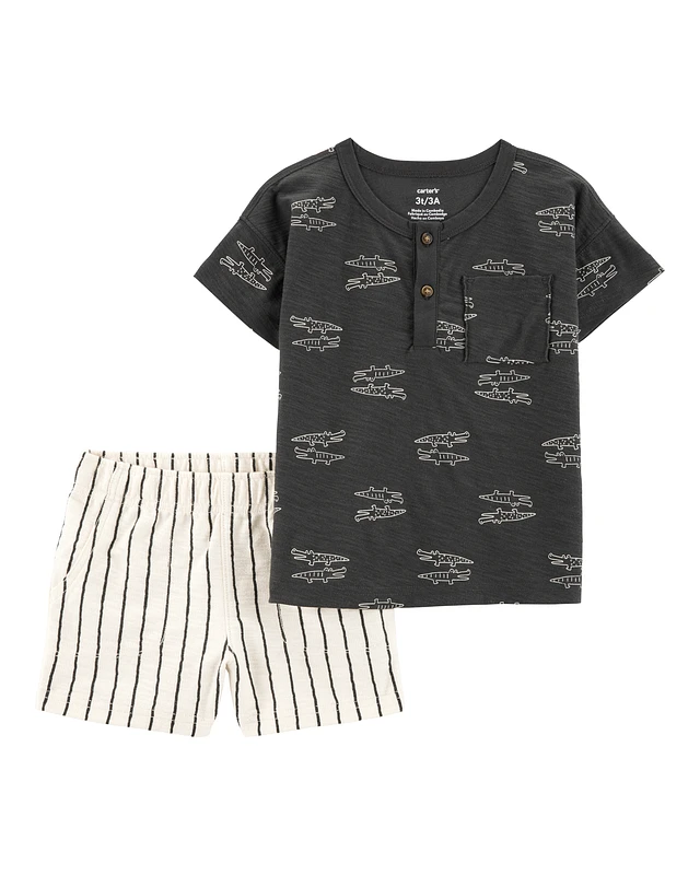 Toddler 2-Piece Alligator Henley Tee & Striped Pull-On Shorts