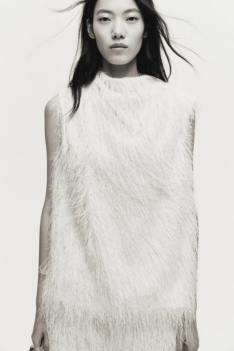 Long, sleeveless top in woven fabric covered in layers of billowing fringe. Cowl neck at front and a low-cut slit at back with a concealed button. Lined.