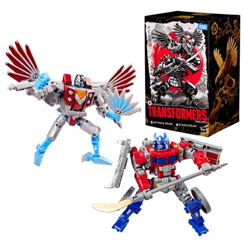Experience Transformers like never before with Transformers Timelines Optimus Prime and Starscream action figures inspired by samurai. The 5.5-inch (14 cm) Optimus Prime action figure converts from samurai robot to ox cart in 27 steps, and the 5-inch (12.5 cm) Starscream action figure converts from robot to falcon in 20 steps. With intricate poseability and themed accessories like a naginata spear and Tengu fan, these Transformers figures make an awesome addition to any collection. Look for more Transformers Timelines sets (each sold separately, subject to availability) featuring unique versions of favorite characters like Megatron, Bumblebee, and more to create a lineup that is: More Than Meets the Eye.