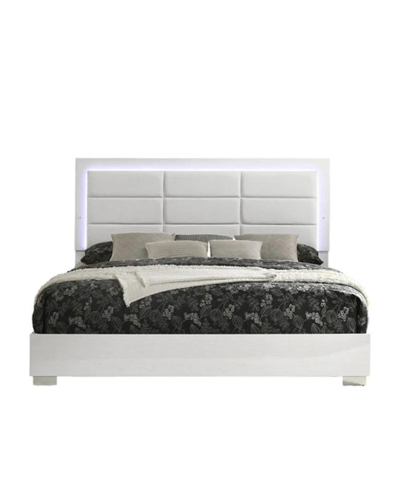 The Vanah King Bed brings modern elegance to your bedroom with its glossy white frame and tufted faux leather headboard. The clean-lined silhouette and reflective finish create a bright, airy atmosphere, while the padded headboard adds comfort and visual texture. Designed to anchor contemporary interiors, this bed pairs beautifully with matching Vanah case goods for a cohesive look. A stylish centerpiece that blends form and function.