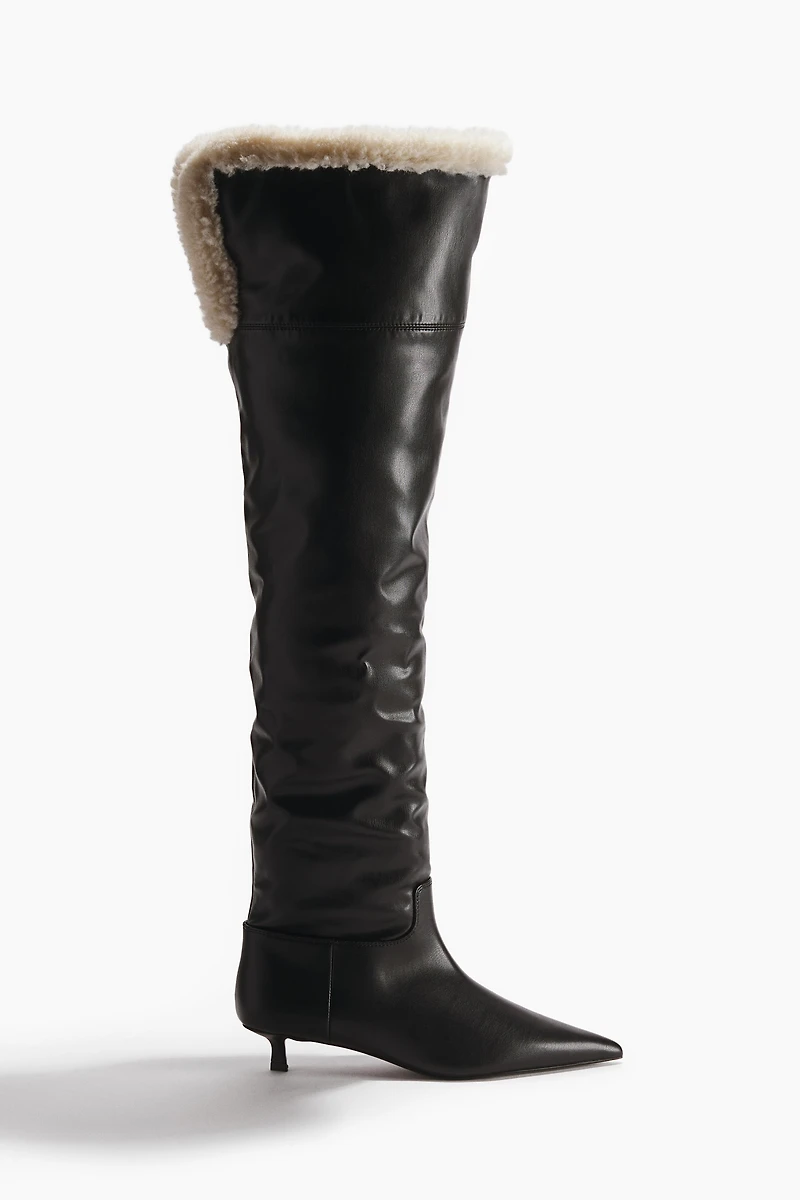 Knee-high boots in coated fabric with foldover opening in soft teddy fleece. Pointed toes, kitten heels, and soft, fluffy lining and insoles to keep feet warm and cozy.