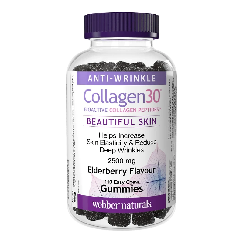Collagen30 gummies from Webber Naturals contain bioactive collagen peptides, which are supported by clinical research to reduce fine lines around the eyes and deep wrinkles. Collagen30 stimulates skin cells to produce more collagen, promoting the appearance of smooth, healthy-looking skin in less than 30 days. All with just three delicious elderberry-flavoured gummies per day | Webber Naturals Collagen30 Bioactive Collagen Peptides Gummies - Elderberry Size 110s