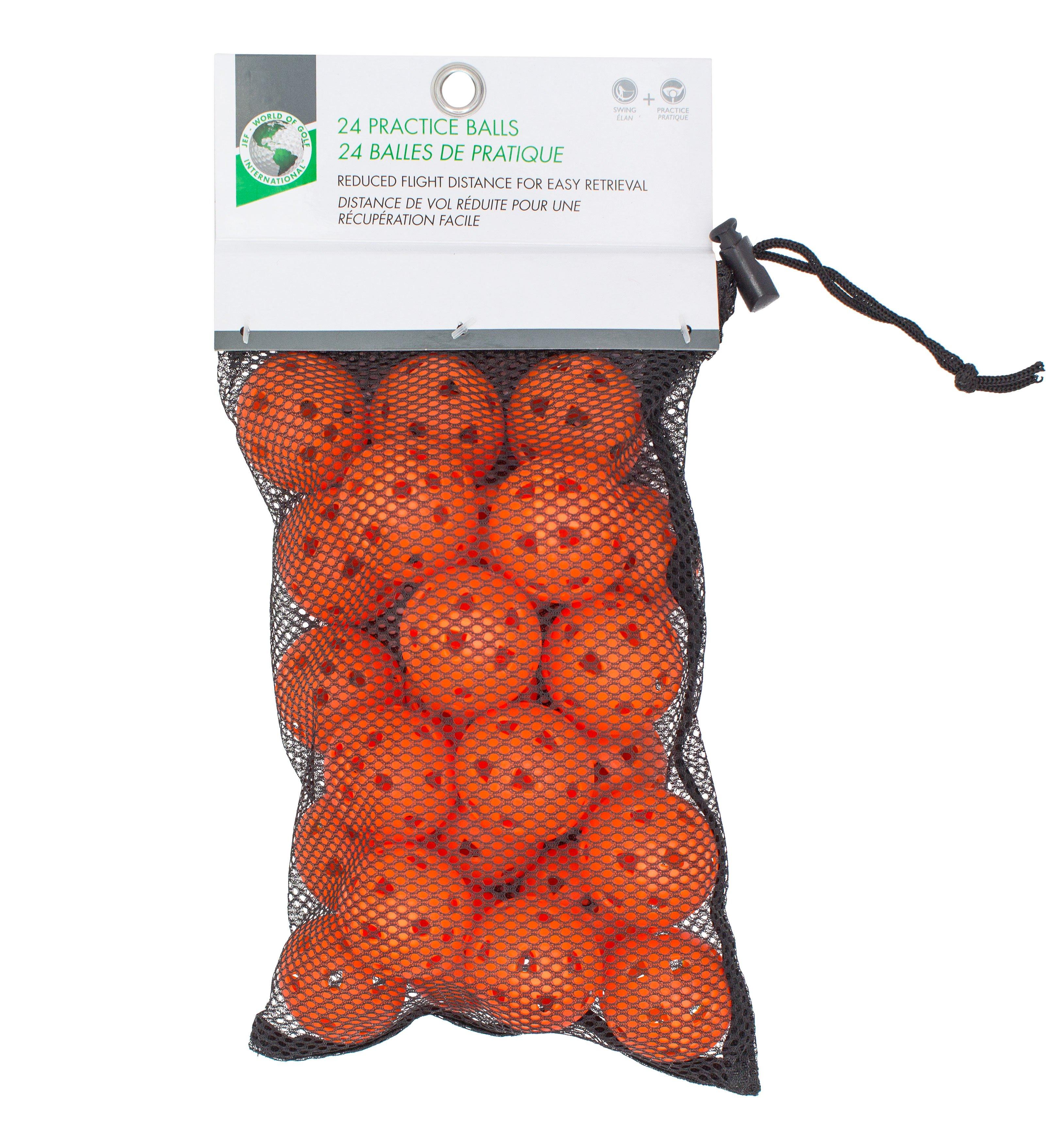 The JEF World of Golf Practice Balls are durable so they can withstand the pressure and impact of a full golf swing. These plastic golf balls not only simulate the flight of a real golf ball but are also the same size as a real golf ball making it the ideal practice ball to perfect your full contact swing. Looking for practice balls both for indoor or outdoor use? The JEF World of Golf Practice Balls' aerodynamic structure provides a limited flight distance making them easier to retrieve.