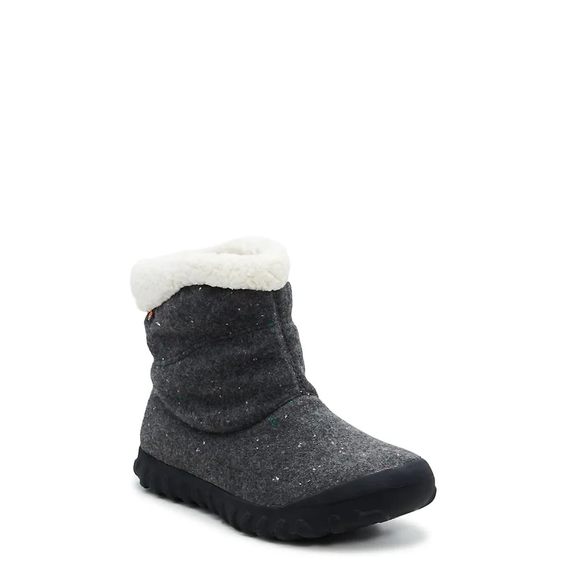 Stay cute, warm, and dry throughout the cold season in these women’s B-Moc II charcoal (grey) winter boots from Bogs. Made of 100% waterproof textile upper, these cold weather booties have a round toe and an easy pull-on design with convenient pull loop at rear. Plush lining and a -30°C cold rating pamper your feet with enhanced comfort. BOGS Max-Wick technology helps evaporate sweat to keep feet dry, while rebound cushioning offers long-lasting energy return and comfort. DuraFresh natural bio-technology activates to fight unwanted odours. The rubber outsole ensures good grip.