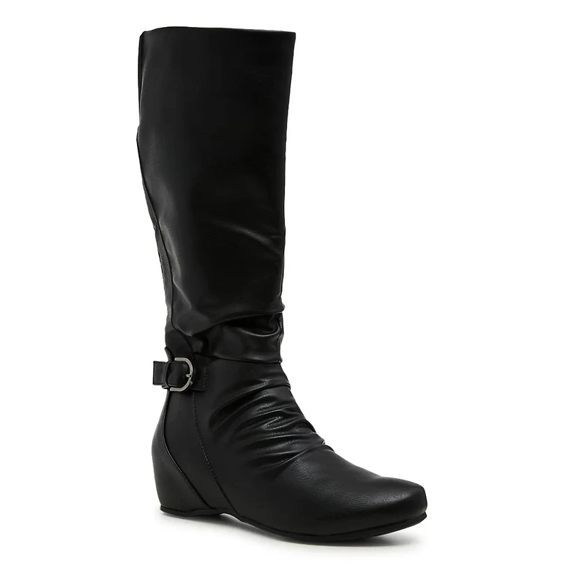 its smooth finish, subtle buckle detail, and hidden wedge, this versatile boot