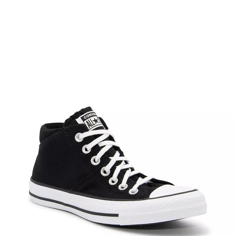Sporty and casual, these women's Converse Chuck Taylor All Star Madison black mid-top fashion athletic shoes are made with a long-lasting canvas upper and are designed with a protective toe bumper. These mid-top sneakers have a lace-up closure, a padded collar, ventilating eyelets on the side, and a traction enhancing outsole.