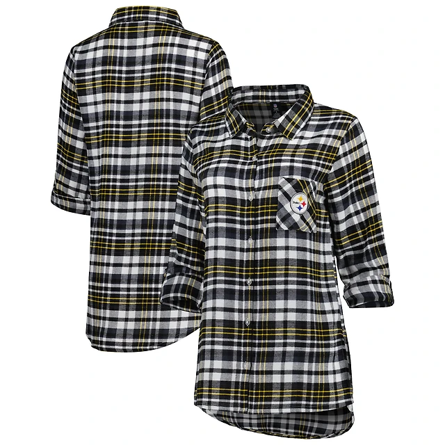 Women's Concepts Sport Black Pittsburgh Steelers Mainstay Plaid Full-Button Long Sleeve Nightshirt