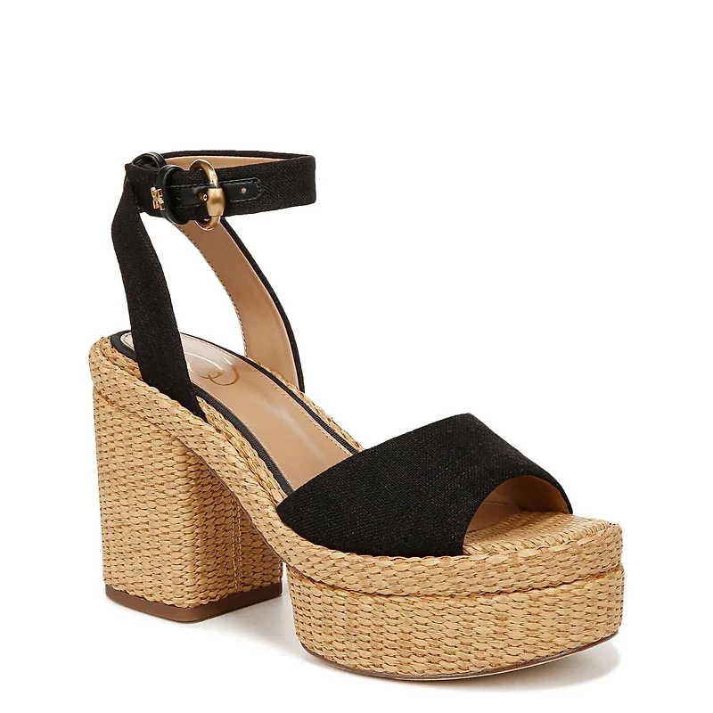 - Textile upperAdjustable ankle strap closureRound open toeSynthetic liningLightly padded footbed1.75" platform, 4" raffia-covered block heelSynthetic sole
