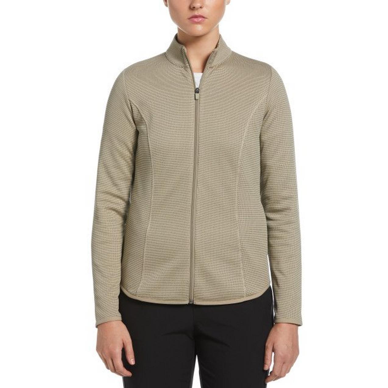 Stay one step ahead of cool weather on the course with this mock neck women’s golf jacket from PGA TOUR Apparel. The ladies’ golf jacket is crafted from a soft, light single knit fabric that’s perfect for layering. It has sun protection to help shield covered areas from damaging UV rays, while moisture wicking helps keep you dry. Stretch shoulder seams add freedom of movement so you can wind up comfortably for each swing. Pockets at the sides add convenient storage, and a curved hem provides extra coverage at the back when you bend. Decorative stitching on the front and back seams adds a flattering detail, for a sleek, sporty look that works just as well for everyday casual wear.