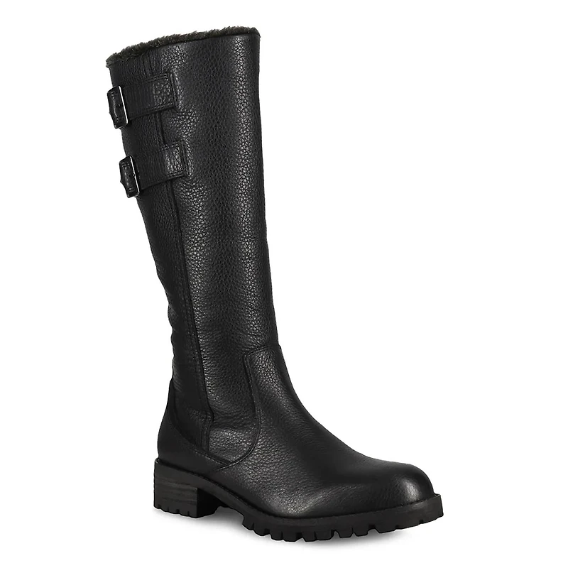 The Santana Women's Napp Tall Boot is crafted with a waterproof leather upper designed to resist moisture, combined with an insulated lining and soft faux fur trim that retain heat, ensuring warmth in temperatures as low as -30°C. It features a convenient side zipper for easy wear, and a durable sole that provides reliable traction on slippery surfaces, enhancing stability in severe winter conditions.