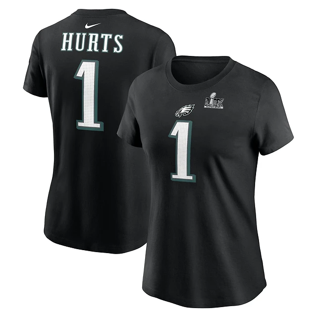 Women's Nike Jalen Hurts Black Philadelphia Eagles Super Bowl LIX Name & Number T-Shirt
