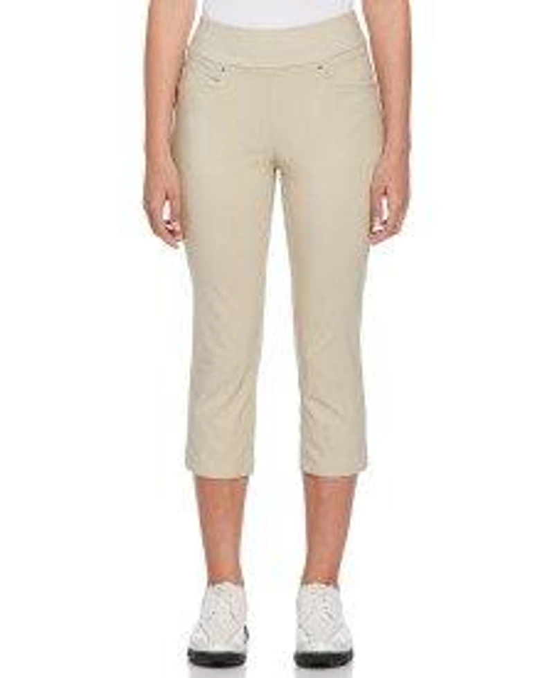 Upgrade your athletic wardrobe with these sleek ladies’ golf capris from PGA TOUR Apparel. The cropped women’s golf pants are crafted from a durable plain weave fabric, with performance stretch to let you bend, crouch and twist comfortably as you play through your round. Sun protection helps to prevent damaging UV rays from passing through the material, while moisture wicking helps to keep you dry. The cropped golf pants have an easy pull-on waist, with Tummy Control built-in shapewear to help provide a smoother silhouette. Featuring a versatile solid-colored design, these golf capris can go straight from the course to a sunny lunch date.