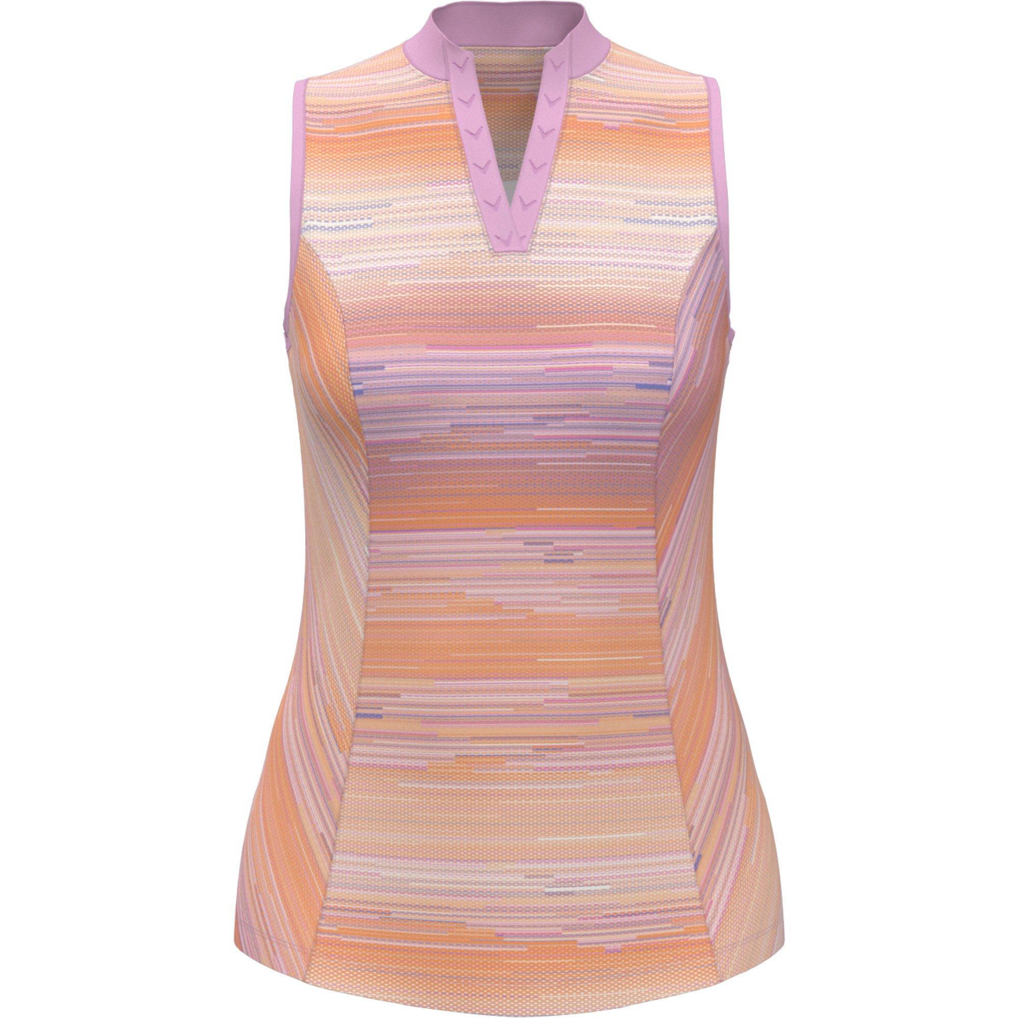 This versatile Callaway women's sleeveless golf shirt offers exceptional functionality on and off the course. Made with recycled polyester for sustainability, this golf polo also includes UV protection and Opti-Dri™ technology for  moisture-wicking comfort. Stretch and Swing Tech™ provide a full range of motion for your swing while the striped print and chevron placket add sporty style to your golf attire.