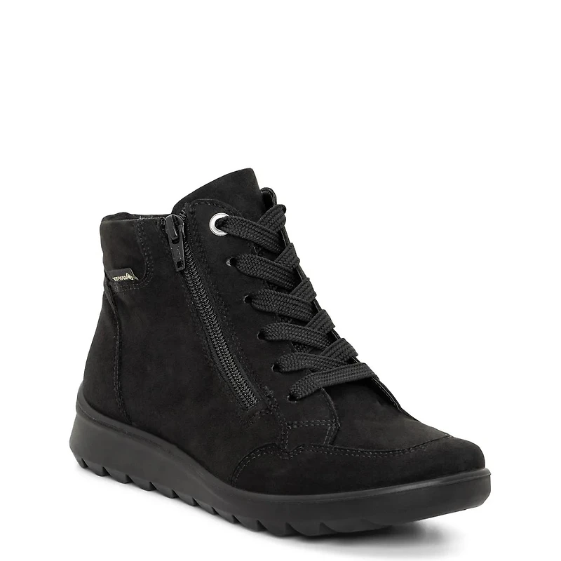 The Ara Women's Thistle Bootie combines a sleek black micro suede upper with a durable leather footbed for lasting comfort. It features a warm Gore-Tex lining that ensures breathability and water resistance, while the lace-up design provides a secure fit. This bootie offers reliable warmth and sturdy construction, making it ideal for everyday wear in cooler conditions.