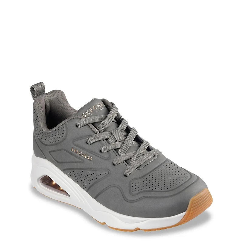 - Synthetic durasuede embossed upperLace-up closureRound toePull loop at rearSkechers logo detailMesh liningSkechers Air-Cooled Memory Foam cushioned comfort insoleSkech-Air triple window visible airbag midsole1¾” heel heightFlexible traction outsole