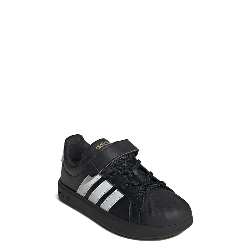 Style meets comfort in these boy's Adidas Streettalk ELC Core black/ftwr white/gold court sneakers. Crafted with durable synthetic upper, these casual/lifestyle sneakers have round toe with textured details for a distinguished appeal, stretch laces and hook & loop instep strap for easy wear and a precise fit. Contrast signature stripes on the side add an authentic touch. Padded tongue and collar offer the needed comfort while chevron tread patterned outsole provides enhanced grip.