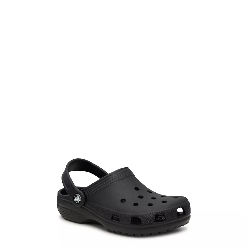 These youth unisex Crocs Classic black clogs are both versatile and functional. The light yet durable Croslite resin foam material and molded design provide exceptional comfort through the day. These easy to clean clogs feature comfortable round toe front that offers roomy fit, while the pivoting heel straps secure your feet in place. The iconic Crocs Comfort offers lightweight comfort and the ventilation holes on these clogs can accommodate Jibbitz brand charms (sold separately).